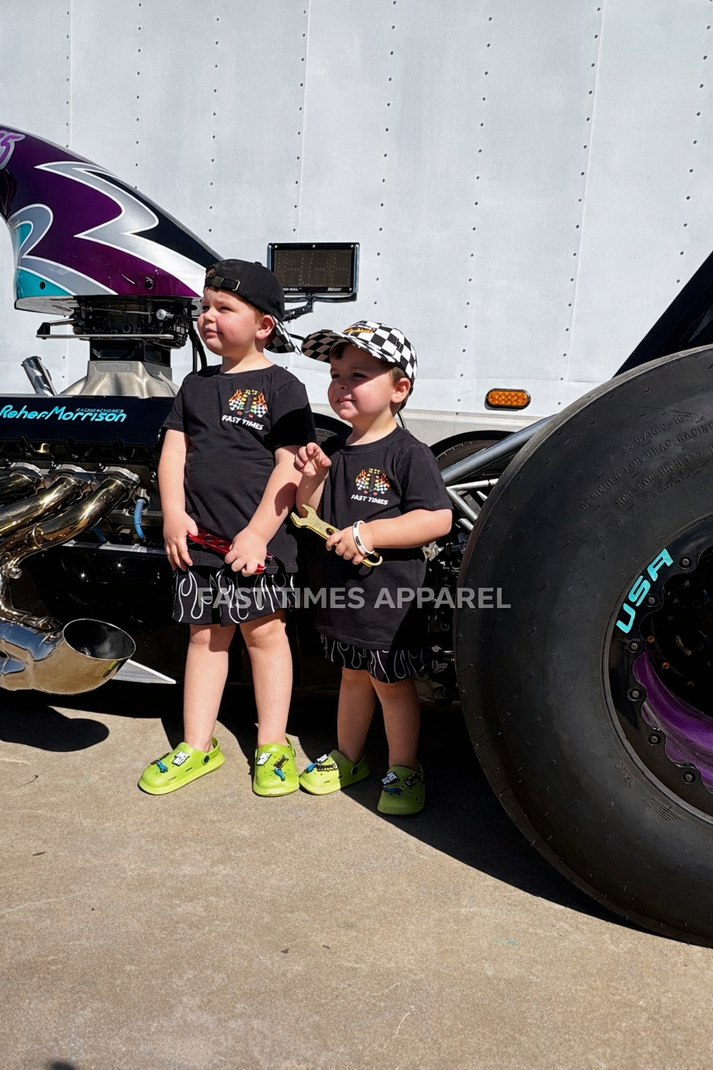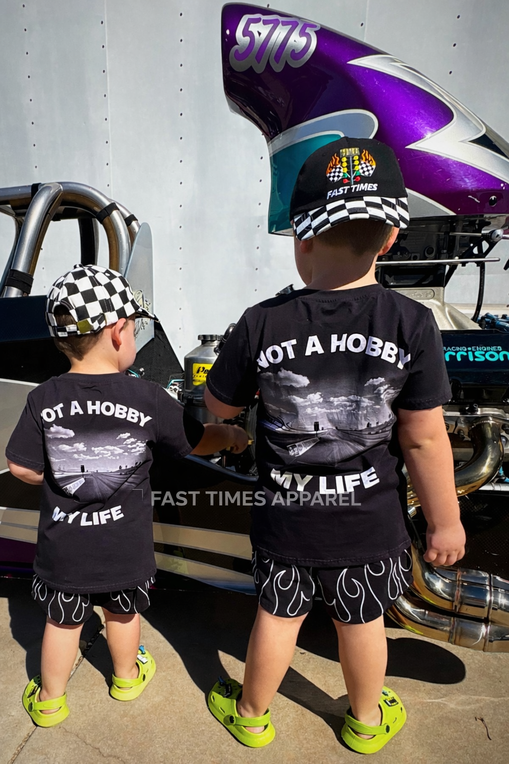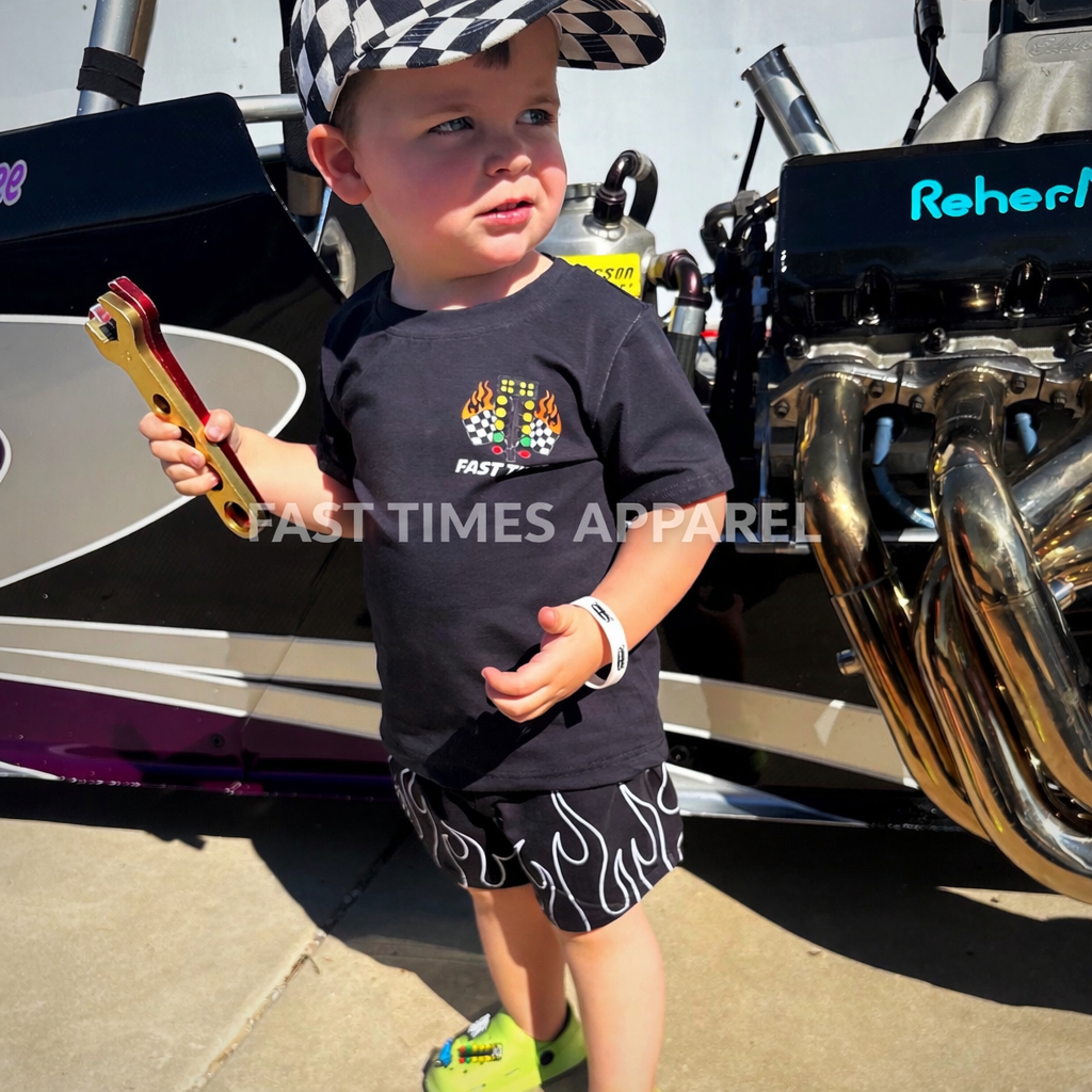 The Fast Times Flame Shorts bring bold racing energy to your little one’s everyday fit. Featuring a standout flame design on a sleek black base, these shorts are perfect for track days, playtime, or pairing with the matching Fast Times tee.